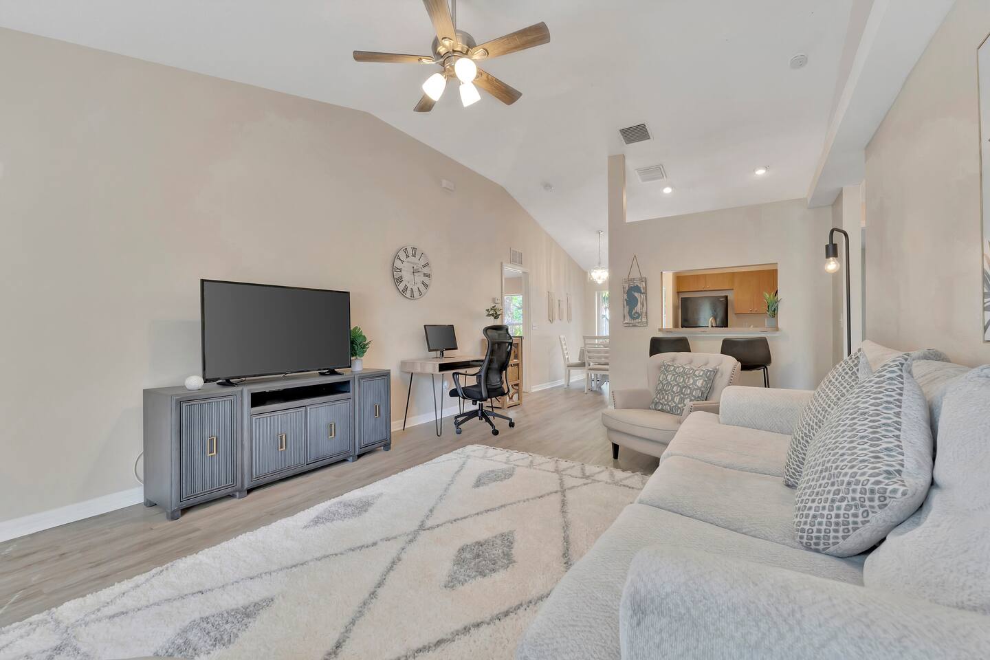 Enjoy easy access to everything from this central, lightly boho themed bungalow in a convenient area of St. Peterburg. (In a quiet neighborhood) Centrally located to downtown St. Petersburg as well as the beaches. • 10 Minute drive to the beach • 12 Minute drive to downtown St Pete (bars, restaurants etc.) • Outdoor dining area on the patio • Gas grill • Firepit and Seating to catch fresh air • Jacuzzi tub in the main bathroom • Dedicated workspace with monitor • Washer & Dryer • Garage