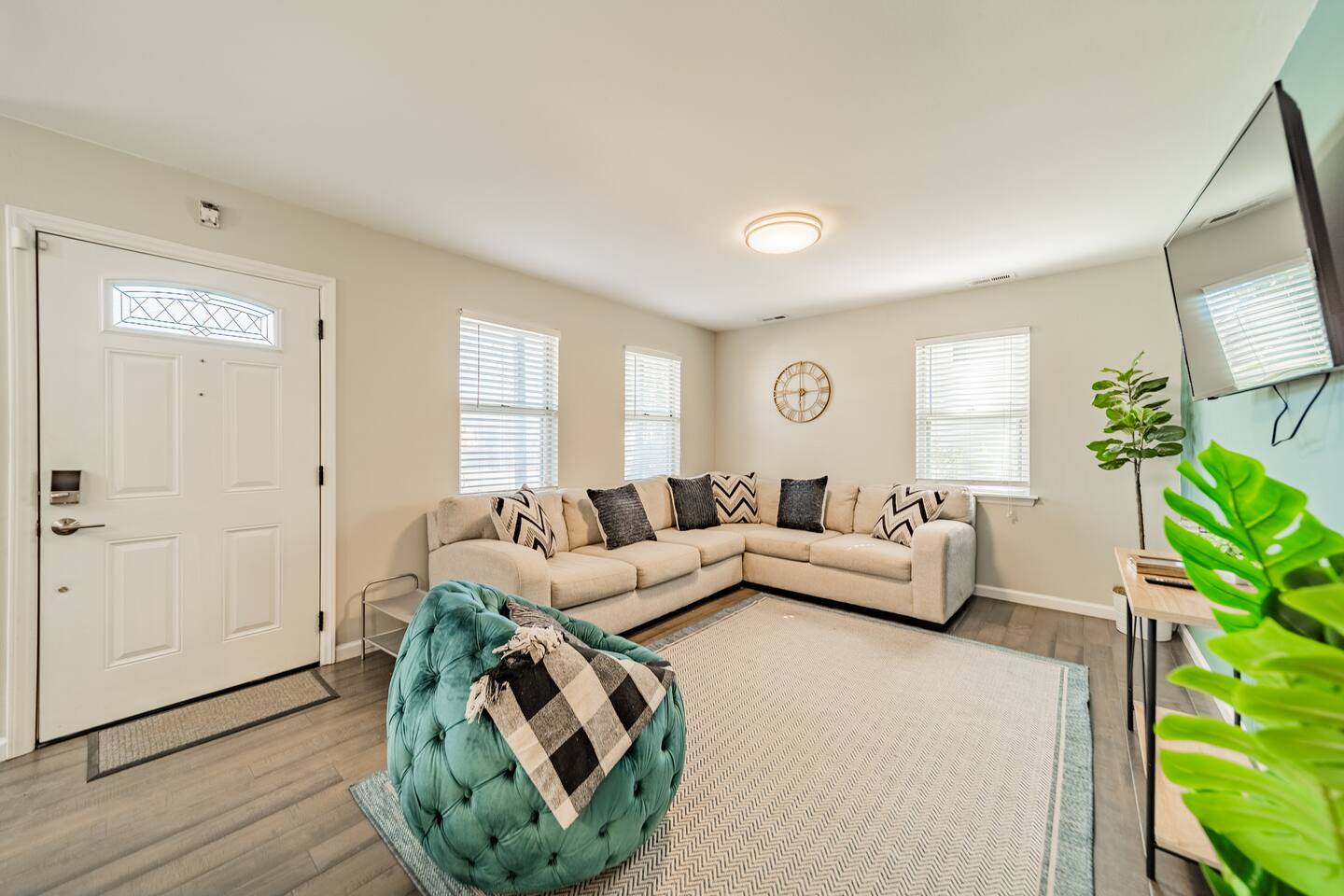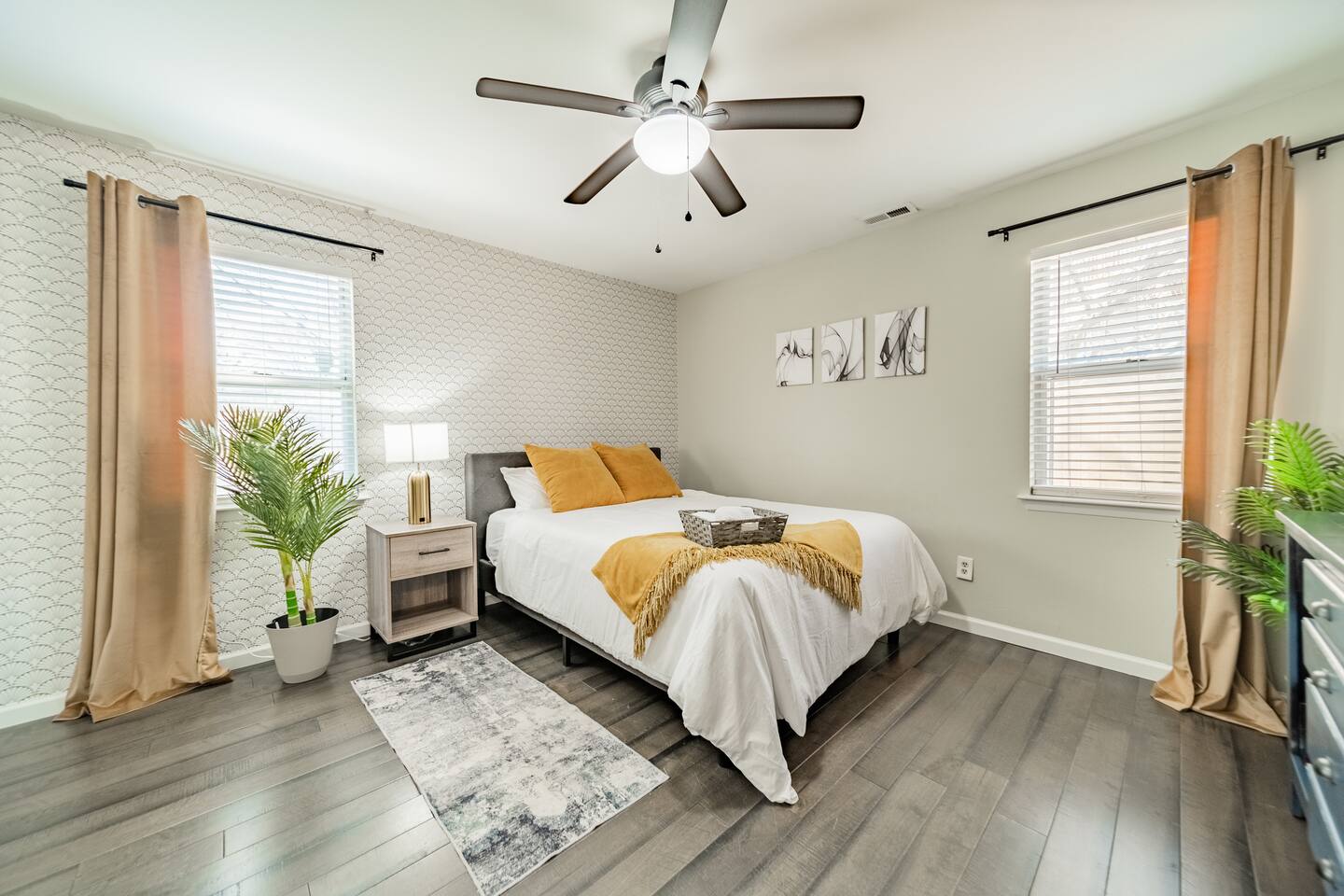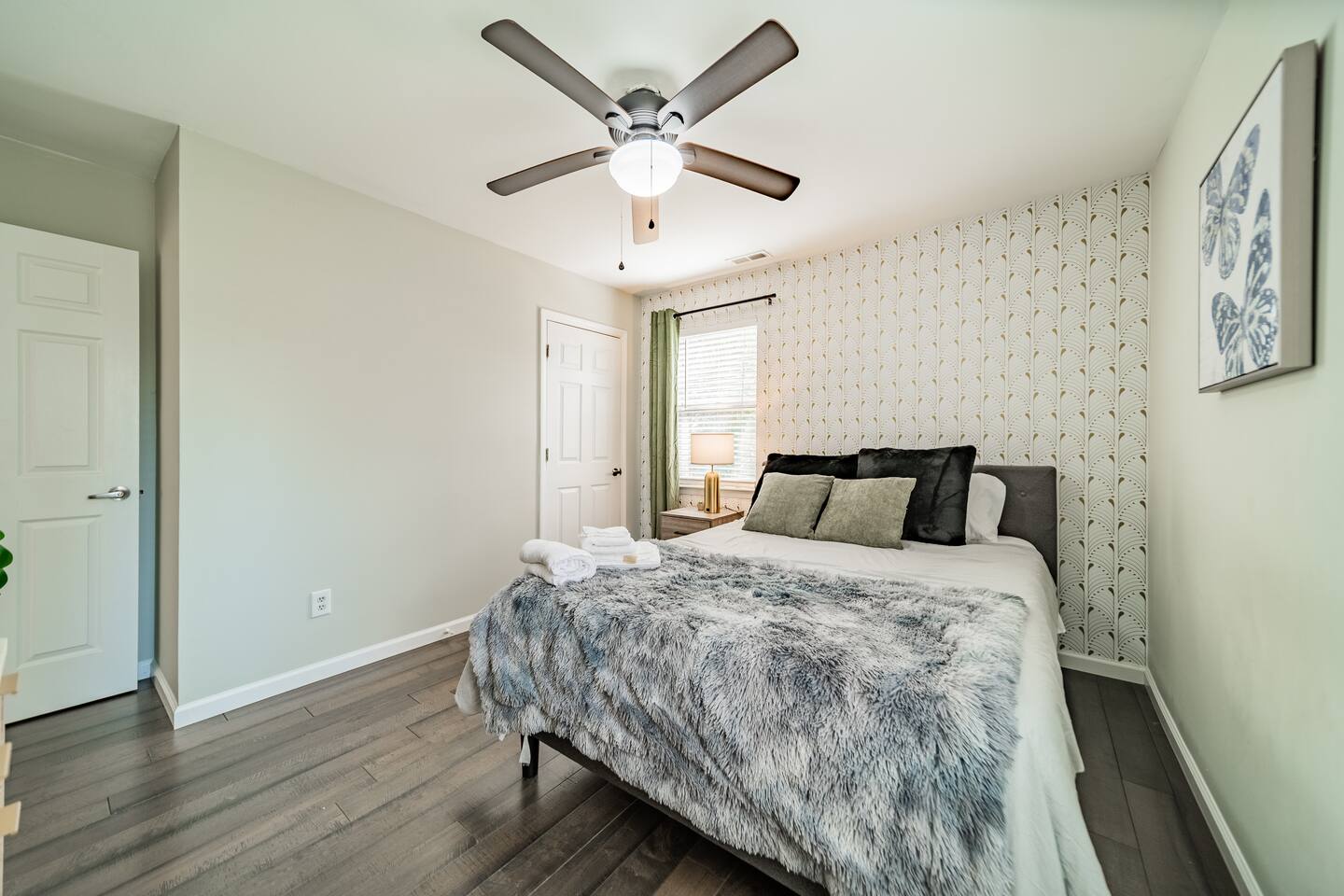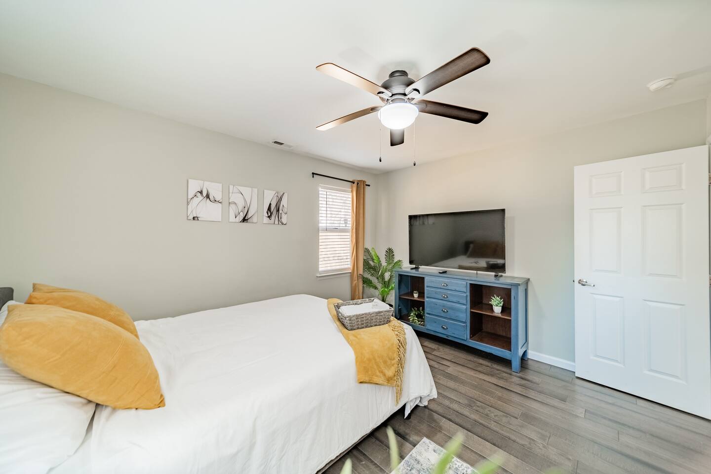 This bungalow is ready to host your next get-together in Charlotte! Step inside from the cute front porch to find an open-concept living/kitchen/dining area with hardwood floors, lots of natural light and plenty of space for everyone to spread out. This 1000+ sq. ft home has 3 bedrooms and 1 bathroom and is completely yours for your entire stay Bedroom 1: Queen Bed | Bedroom 2: Queen Bed | Bedroom 3: Queen Bed LIVING ROOM • 50" 4K Smart TV • Comfortable sectional for up to 6 guests BEDROOM 1 • 55" 4K Smart TV • Queen Bed • Memory foam mattress • 1800 thread count bed linen • Custom closet space BEDROOM 2 • 55" 4K Smart TV • Queen Bed • Memory foam mattress • 1800 thread count bed linen • Closet with hangers BEDROOM 2 • Queen Bed • Memory foam mattress • 1800 thread count bed linen • Closet with hangers • Iron & ironing board KITCHEN AND DINING • Fully equipped w/ Samsung stainless steel appliances • Microwave, oven and dishwasher • Dining table and counter seating • Coffee Dispenser w/ starter K-Cups • Basic cooking supplies LAUNDRY AREA • Samsung washer & dryer LOCATION • The bungalow sits across the street from Cordelia Park, which includes a winding creek, greenway paths and a community pool. • No car? No problem! You’ll be able to walk to Optimist Hall, which is filled with food & drink options, and the light rail stop is at the end of the block.