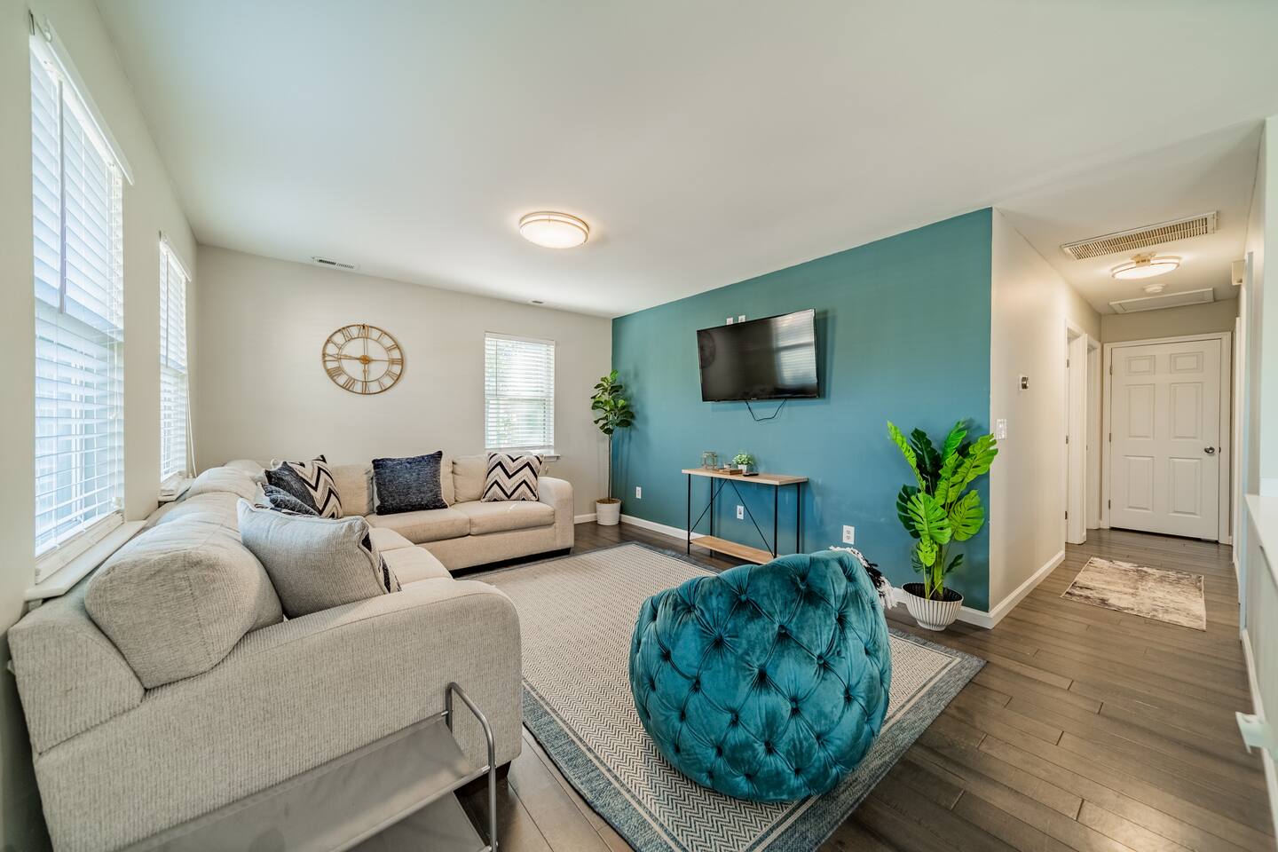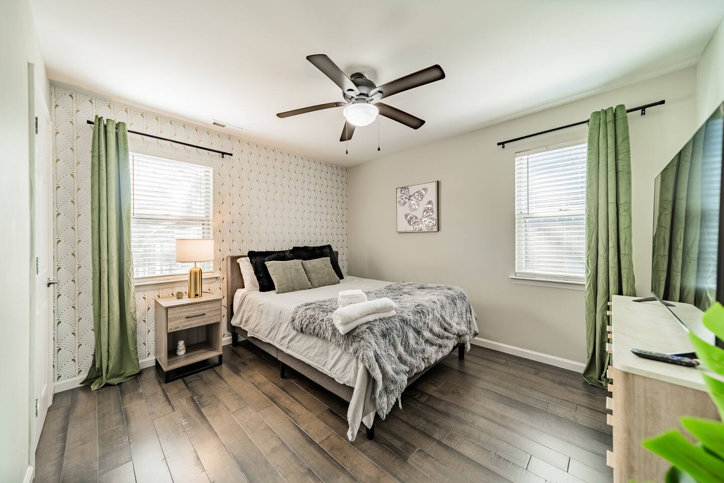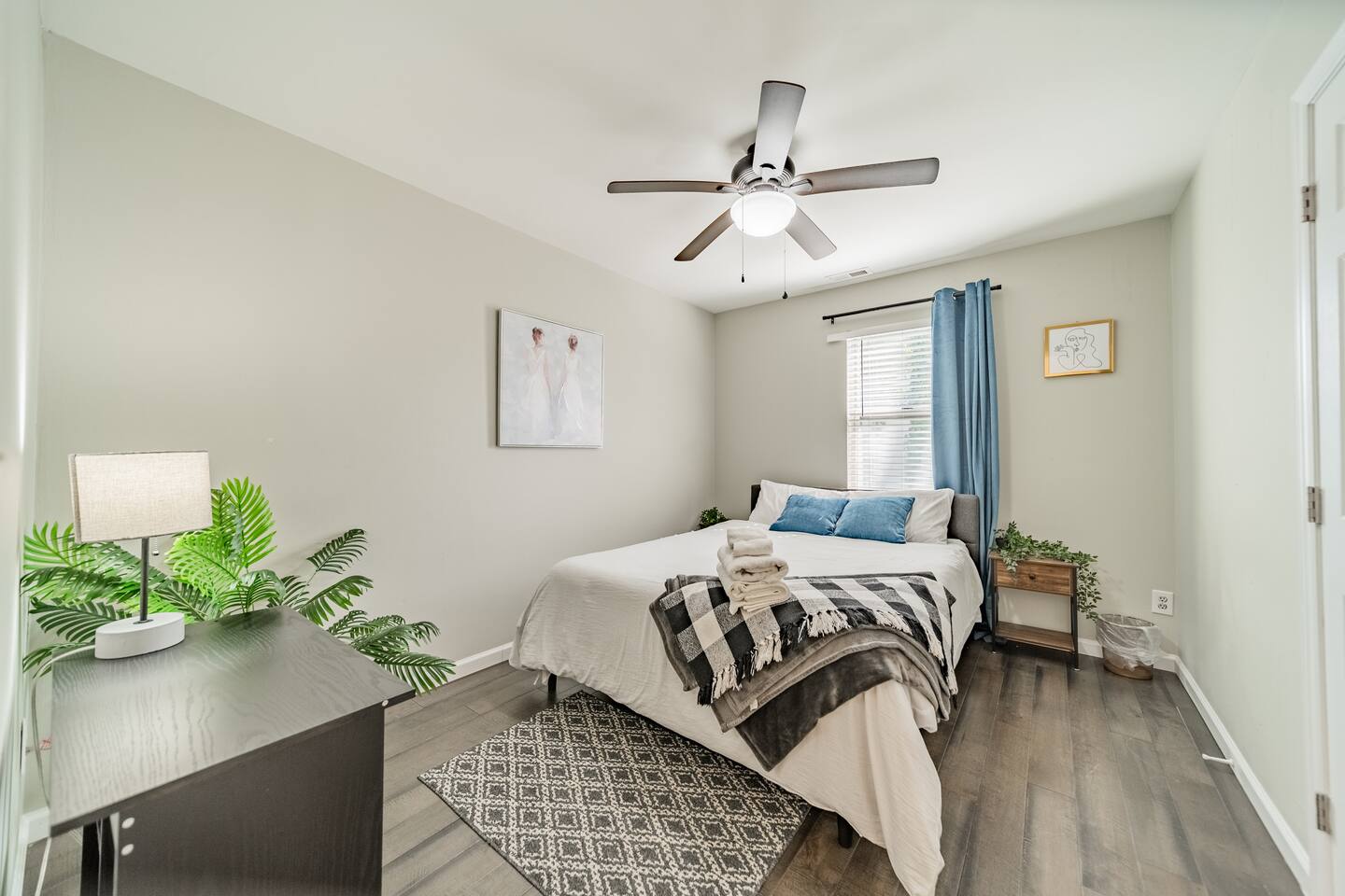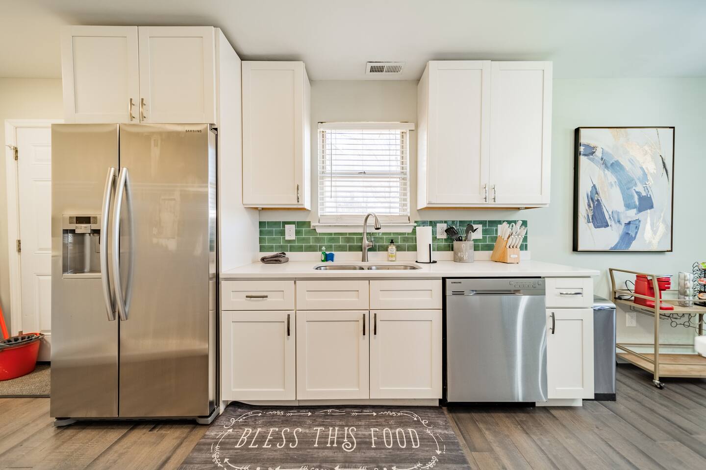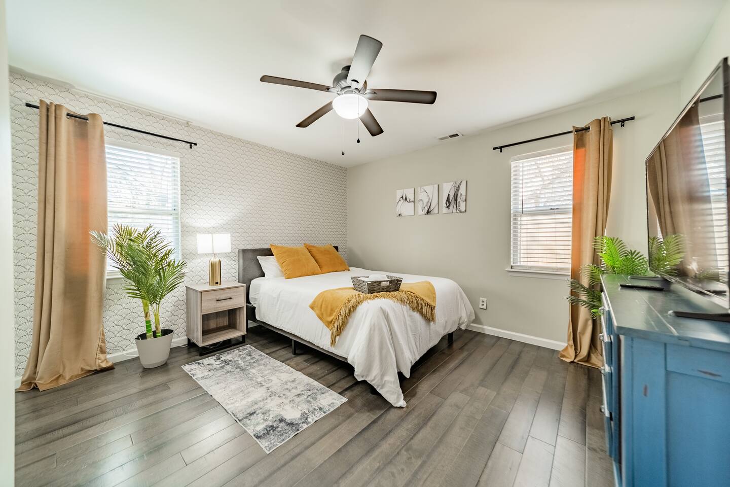 This bungalow is ready to host your next get-together in Charlotte! Step inside from the cute front porch to find an open-concept living/kitchen/dining area with hardwood floors, lots of natural light and plenty of space for everyone to spread out. This 1000+ sq. ft home has 3 bedrooms and 1 bathroom and is completely yours for your entire stay Bedroom 1: Queen Bed | Bedroom 2: Queen Bed | Bedroom 3: Queen Bed LIVING ROOM • 50" 4K Smart TV • Comfortable sectional for up to 6 guests BEDROOM 1 • 55" 4K Smart TV • Queen Bed • Memory foam mattress • 1800 thread count bed linen • Custom closet space BEDROOM 2 • 55" 4K Smart TV • Queen Bed • Memory foam mattress • 1800 thread count bed linen • Closet with hangers BEDROOM 2 • Queen Bed • Memory foam mattress • 1800 thread count bed linen • Closet with hangers • Iron & ironing board KITCHEN AND DINING • Fully equipped w/ Samsung stainless steel appliances • Microwave, oven and dishwasher • Dining table and counter seating • Coffee Dispenser w/ starter K-Cups • Basic cooking supplies LAUNDRY AREA • Samsung washer & dryer LOCATION • The bungalow sits across the street from Cordelia Park, which includes a winding creek, greenway paths and a community pool. • No car? No problem! You’ll be able to walk to Optimist Hall, which is filled with food & drink options, and the light rail stop is at the end of the block.